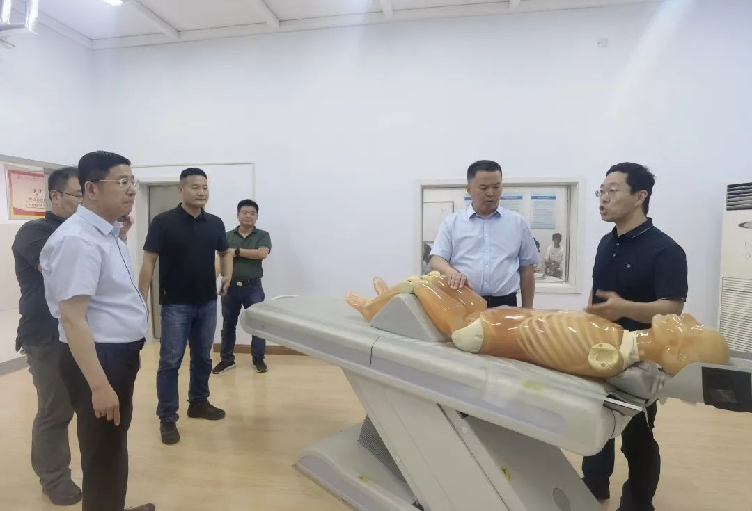 在齐鲁医药公司,医学影像公司党总支书记、经理宿连政等热情接待了明辉一行,陪同参观了DR实训室、CT实训室、MR实训室、超声实训室、医学影像虚拟仿真实训室等实验实训室。在座谈中,双方围绕医学影像人才培养、硕士点申报、附属医院建设以及线上合作教学等进行了交流与探讨。