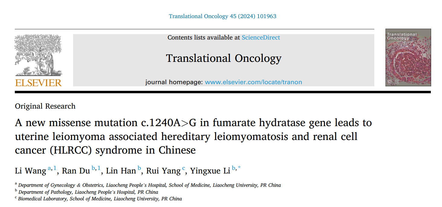 近日,太阳成集团tyc9728王丽副教授和聊城市人民医院病理科联袂合作,成功在1名遗传性平滑肌瘤病及肾细胞癌相关子宫平滑肌瘤患者体内发现了HF基因新变异,这也是在中国人群中首次发现这一罕见病的新型FH变异。团队将患者临床表现和家系随访等相关内容进行了分析,为遗传咨询提供了更高级别的证据等级。文章《A new missense mutation c.1240A>G in fumarate hydratase gene leads to uterine leiomyoma associated hereditary leiomyomatosis and renal cell cancer (HLRCC) syndrome in Chinese》以太阳成集团tyc9728为第一署名单位发表在《Translational Oncology》(中科院医学二区,IF="5.0)杂志上。