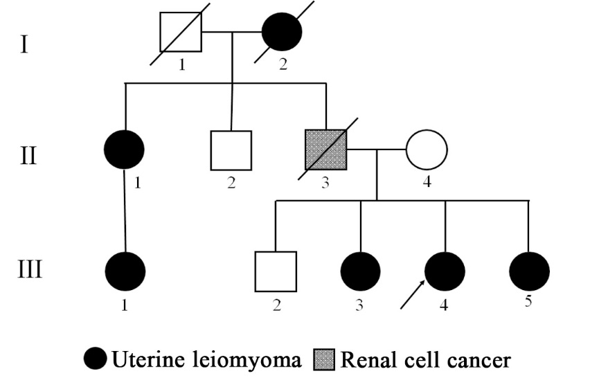 先证者Ⅲ-4是1名35岁女性,发现子宫肌瘤6年,月经量增多1年。家族史:其父亲Ⅱ-3因“肾集合管癌”在55岁时去世,母亲Ⅱ-4健在,其姐姐Ⅲ-3和妹妹Ⅲ-5均因“子宫肌瘤”在30岁时行手术治疗,其哥哥Ⅲ-2健在。另外,其祖母Ⅰ-1患有子宫肌瘤,50岁去世,具体死因不详,其祖父Ⅰ-1于80岁时去世,具体死因不详。其姑姑Ⅱ-1和表姐Ⅲ-1均因子宫肌瘤行手术治疗,其伯父健在Ⅱ-2。