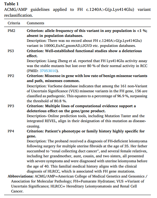 此病人最初疾病确诊时,FH c.1240A>G(p.Lys414Glu)当时的证据仅为PM2、PP2、PP3, 根据ACMG/AMP标准,FH c.1240A>G(p.Lys414Glu) 判读为临床意义不明变异(variants of uncertain significance,VUS)。该临床意义不明变异无法给出疾病明确的解释,增加患者临床管理的不确定性,并可能产生与致病性变异一样多的焦虑。所以,团队通过收集表型、分析家系、查阅数据库及相关功能实验等方式,持续努力地对每个VUS进行重新分类,明确其与疾病的关系。成功地将FH c.1240A>G(p.Lys414Glu)变异升级为likely pathogenic,并为患者提供了更好的遗传咨询、子宫再发肌瘤处理建议,肾脏肿瘤早期筛查建议。