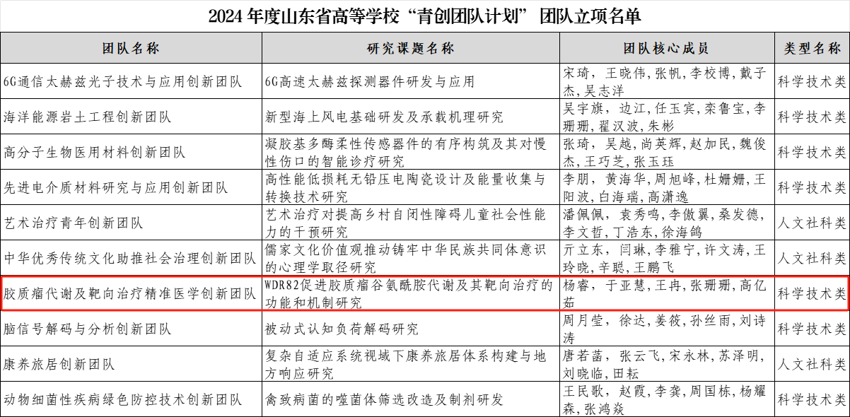 根据山东省教育厅《关于公布2024年度山东省高等公司“青创团队计划”团队立项名单的通知》,太阳成集团tyc9728杨睿带领的“胶质瘤代谢及靶向治疗精准医学创新团队”获得立项。