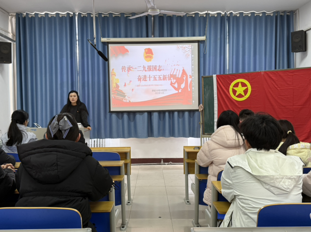 史秋波以“传承一二九报国志,奋进十五五新征程”为主题,围绕“青春融入国家发展”展开核心发言:她指出“十五五”是国家建设的关键五年,也是青年担当奋进的五年,阐释了党的二十届四中全会对青年在高质量发展、全过程人民民主、国家安全三个方面的要求,点明了青年是国家治理的关键力量。同时,她详细介绍“十五五”战略下青年可施展才华的领域——投身科技创新领域攻关前沿技术、参与乡村振兴一线的医疗与教育工作、助力绿色低碳领域的生态文明建设、在文化传承领域弘扬传统、传播中国故事,为同学们指明将个人理想融入国家发展的实践方向,发言极具启发意义与感召力。发言尾声,全体团员起立,在领誓人的带领下重温入团誓词。铿锵誓言回荡全场,既承载着新时代青年对共青团组织的赤诚初心,也凝聚着传承“一二九”爱国精神、勇担“十五五”时代使命的坚定信念。最后,冯昌顺对“十五五”青年机遇进行简要分析,并激励同学们要抓住时代契机抓紧行动,将青春热血融入国家发展,以实际行动积极响应国家“十五五”号召。