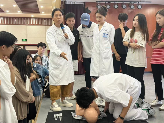 本次活动采用理论和实践相结合的讲授方法。首先由老师向大家详细介绍CPR的基本原理和操作流程,并提出在开展心肺复苏过程中的注意事项,志愿者应用“模拟人”向同学们演示了心肺复苏的基本流程,重点对胸外按压的力度和频率、口腔异物的清理、口对口人工呼吸的环节进行示范。随后,支教同学积极参与CPR的实践操作,在专业老师和志愿者的帮助下提高自救和急救的水平。最后,培训老师向大家介绍了气道异物阻塞的处理方法——海姆立克急救法,如果员工出现气道异物阻塞的情况,教师应当及时采取措施,如背部拍击、腹部冲压等,帮助员工排出异物,保证呼吸通畅,保障员工生命安全。