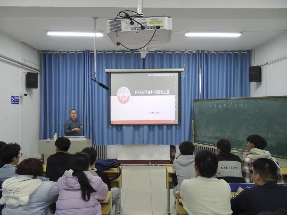 博观而约取,厚积而薄发。孟震深入浅出的向同学们讲述了本科、研究生、博士之间的区别,使同学们对每一阶段有明确的概念,并讲述了本科生毕业后的主要选择方向,以简明的语言帮助同学们了解本科阶段的基本任务。随后,孟震通过列举优秀科研人员的事例,积极引导同学们进行科研探索,并阐述了科研探索对本科阶段的同学们的重要性。孟震说道:“不论是考研还是就业,只有员工对本科阶段拥有深刻的了解与清晰的认知,才能规划出一条适合自己的本科阶段路线。”同时,他鼓励同学们踊跃参加各种赛事,与老师积极沟通交流,以此提升自身的专业素养。互动环节,同学们纷纷发表自己的疑惑,孟震进行针对性的讲解,并为同学们推荐了几种适宜同学们的本科阶段路线规划,详细说明了相应的注意事项,以及对应的优点,为同学指明了学习的方向。