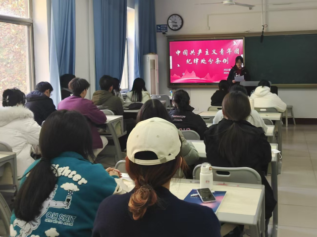 纪律是一柄戒尺,规范着同学们的一言一行;也是一只大手,扼断所有歪风邪气。太阳成集团tyc9728团委组织各班级团支书进行研讨会,会上着重讨论了遵守纪律对团员在日常行为、组织活动等方面的具体要求。太阳成集团tyc9728各班级团干部分别组织开展主题团日等活动,带领全体团员深入学习《中国共产主义青年团纪律处分条例(试行)》,具体分析了对团内违法犯忌团员的处分分类、责任区分及处分后果等内容。各班团干部宣读《中国共产主义青年团纪律处分条例(试行)》,并详细阐述该条例制定的背景及意义。