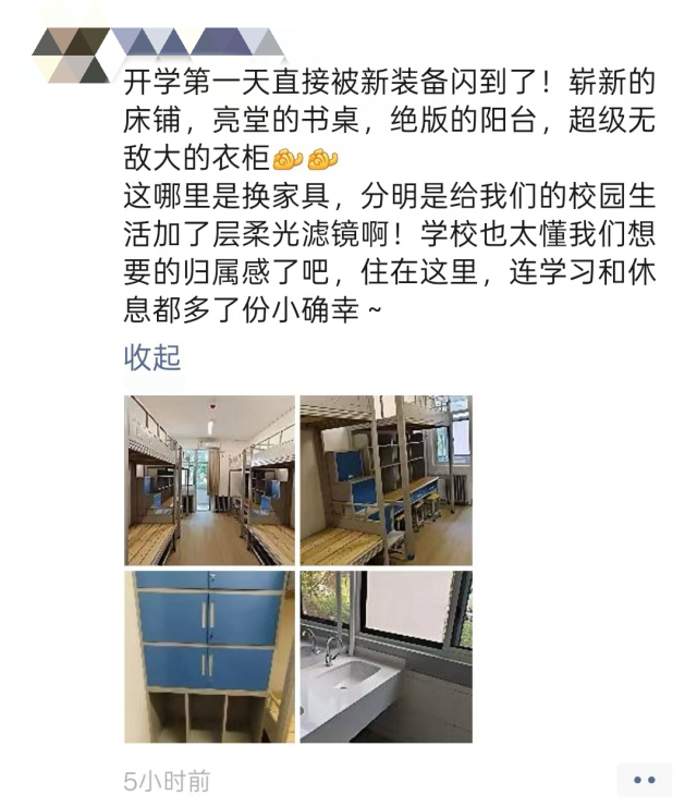 学子们的分享里,既有对宿舍新貌的细致展示,更有对校园建设者的深深敬意。“感谢母校不辞辛苦的最美校园建设者们!”薛诗冉的这句话,道出了所有入住“新”宿舍员工的心声。暑期高温酷暑,建设者们坚守岗位,加班加点推进工程,用汗水与匠心将旧宿舍打造成温馨家园。正是他们的默默付出,才有了开学季学子们的满心欢喜,才有了校园里这份浓浓的幸福感与归属感。