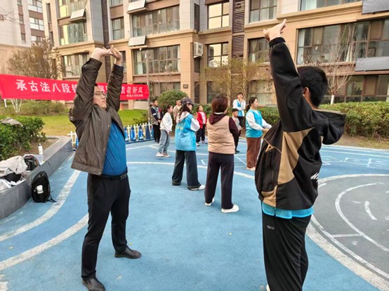 活动现场,志愿者先以生动的讲解拆解八段锦的文化渊源与养生价值,再将“双手托天理三焦”“左右开弓似射雕”等招式拆解为易懂的动作要领:教小朋友们时,用“伸手够云朵”“拉弓射气球”的趣味比喻,让小朋友们在笑声里舒展筋骨;指导家长们时,则同步示范发力技巧,帮家长们在轻缓动作里放松肩颈、舒缓日常疲惫。孩童的雀跃与家长的舒展交织在社区广场:小朋友们跟着招式蹦跳却格外专注,家长们的动作从生涩渐趋舒展,居民们纷纷加入队伍,跟着抬手、转身,把午后的时光晕染得松弛而温暖。