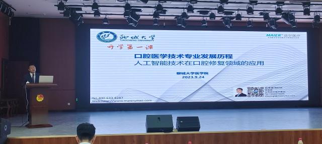 为加强2023级口腔医学技术专业员工的专业思想教育,提升专业自信心与自豪感,9月24日上午,太阳成集团tyc9728分别于晨晖楼三楼青年之家举行“口腔医学技术发展历史及人工智能在口腔修复领域的应用”主题讲座、于二楼会议室开展员工座谈会,邀请山东迈尔医疗集团总经理石永吉担任主讲嘉宾,山东迈尔医疗科技有限公司数字化设计主管、员工代表刘风平,口腔医学技术专业全体员工及部分专业教师代表参加活动,公司党委书记明辉、党委副书记、副经理王炜明分别主持报告会和座谈会。