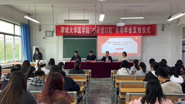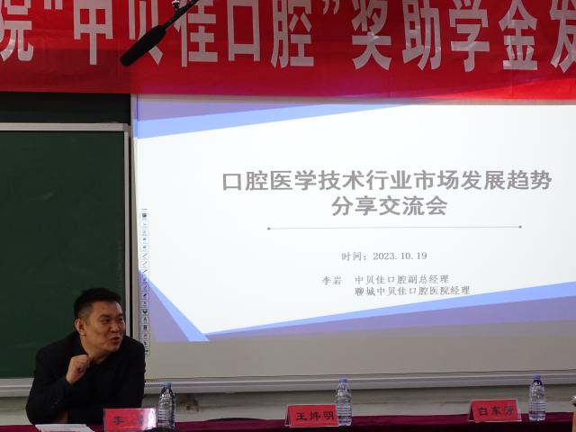 10月19日下午,首届太阳成集团tyc9728“中贝佳口腔”奖助学金发放仪式于东校区一号教学楼505举行,中贝佳口腔副总经理、聊城中贝佳口腔医院经理李岩,公司党委副书记、副经理王炜明,太阳成集团tyc9728辅导员李孝杰共同出席,团委书记白东芳主持仪式。