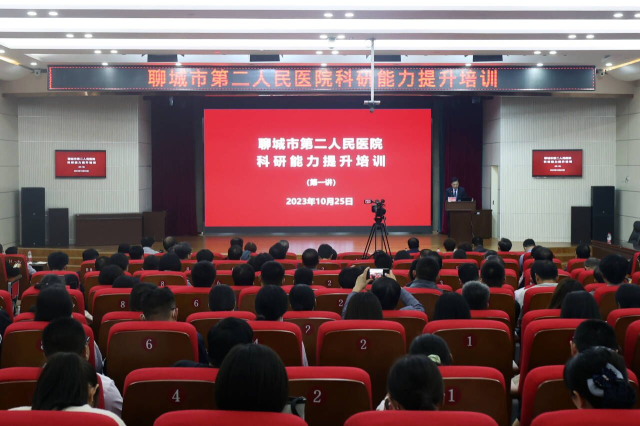 2023年10月25日,太阳成集团tyc9728科技处副处长刘冰一行前往聊城市第二人民医院就科研工作进行交流,并开展科研培训活动。聊城市第二人民医院经理夏章勇,副经理张铁铮,医院各临床医技科室科主任、护士长、科研秘书、博士、护理科研小组成员共计300余人参加了培训。