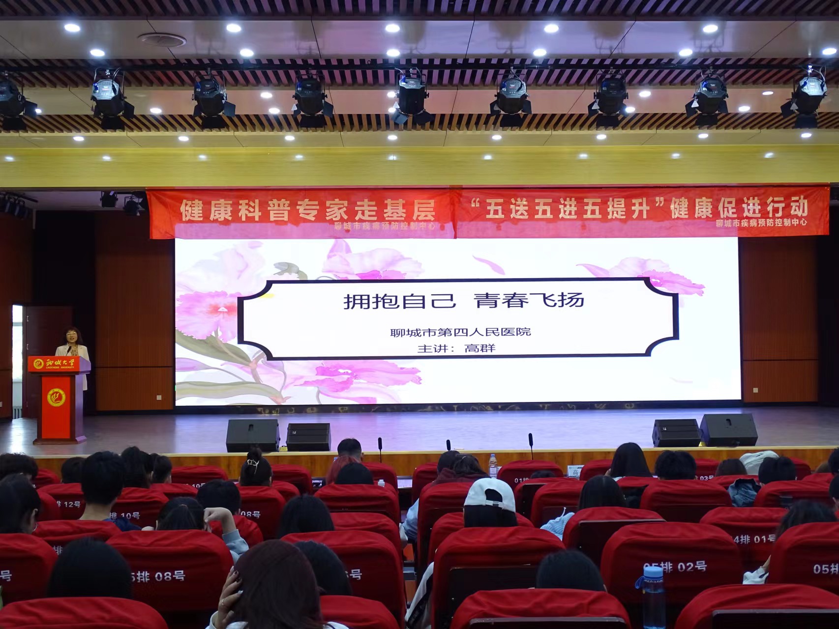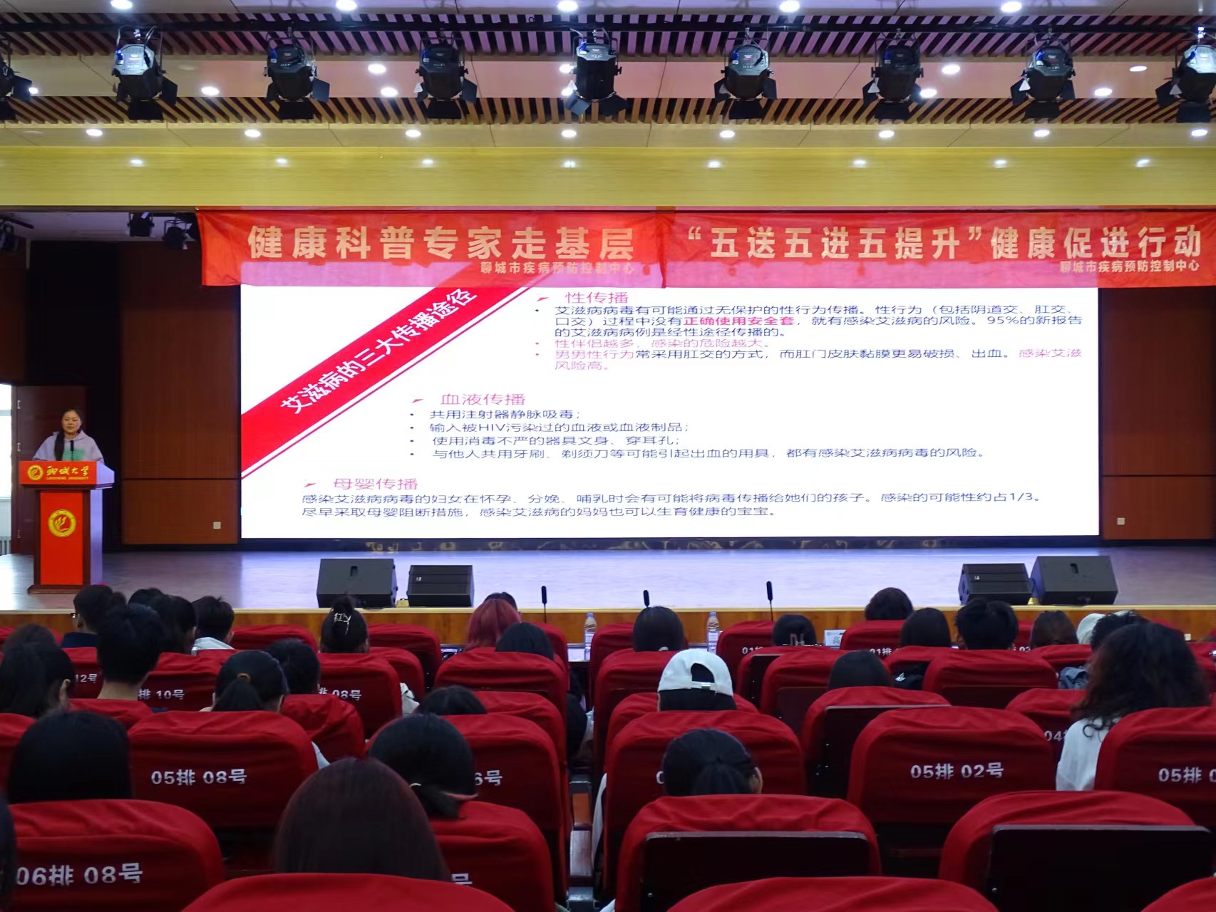 活动现场,医护讲师们分别围绕艾滋病、献血、心理健康、急救知识四部分展开讲解。刘芳从多个方面详细介绍艾滋病,并着重讲解如何预防艾滋病,希望大家不要谈“艾”色变。赵瑞英从实际入手,分别讲解对无偿献血者的要求、献血的好处、献血流程及献血前后的注意事项等。活动现场气氛活跃,掌声不断,同学们积极提问,老师们热情回复。高群对人际交往常见的心理问题、焦虑和抑郁障碍,以及如何拥抱自己的情绪等方面进行授课,他通过生动的案例讲解,帮助大家学习如何进行心理减压和疏导个人情绪。