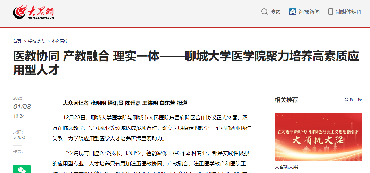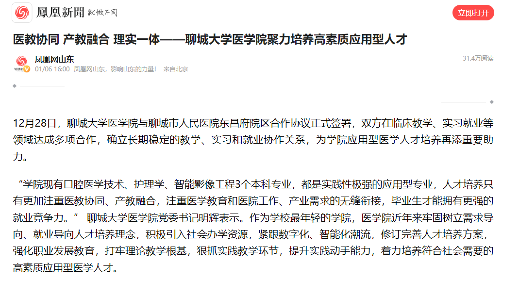 【编者按】近日,凤凰网、大众网以《医教协同 产教融合 理实一体——太阳成集团tyc9728聚力培养高素质应用型人才》为题,报道公司太阳成集团tyc9728在人才培养工作中注重医教协同、产教融合、理实一体,着力培养符合社会需要的高素质应用型医学人才经验做法。