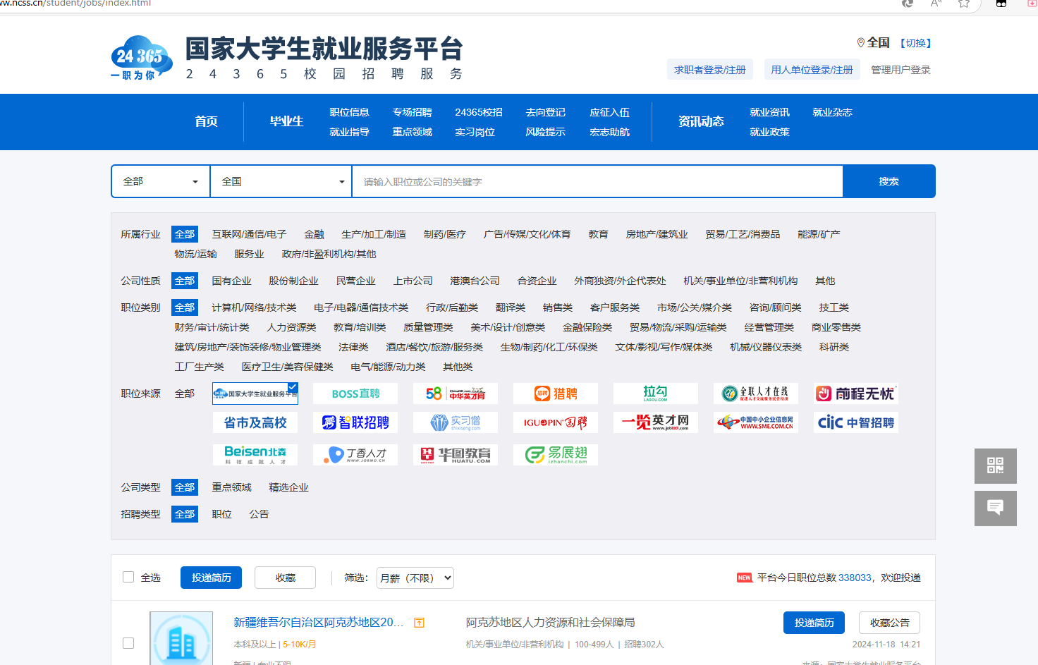 24365国家老员工就业平台: https://www.ncss.cn/student/jobs/index.html